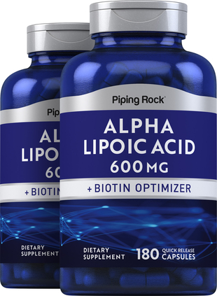 Alpha Lipoic Acid is a powerful antioxidant made by the body, also found in a variety of nutritious foods. Piping Rock Alpha Lipoic Acid provides 600 mg per serving of this antioxidant, with the special addition of biotin in quick-release capsules for ultimate support. Get fantastic quality and exceptional value today with Piping Rock!