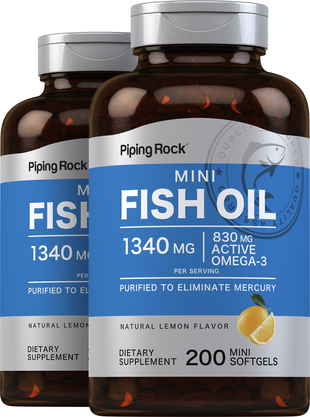 Piping Rock Omega-3 Mini Fish Oil is anything but mini on benefits! Our formula features 1,340 mg of purified fish oil per serving in convenient mini softgels. This high potency supplement is the best way to get all the benefits of omega-rich fish with delicious natural lemon flavor. It’s purified to eliminate mercury, making it a popular choice for men and women everywhere!
