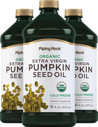 Introducing Piping Rock's Organic Extra Virgin Pumpkin Seed Oil! Cold-pressed from the seeds of pumpkins (also called pepitas), pumpkin seed oil contains important fatty acids, such as linoleic, oleic, palmitic and stearic acids. These beneficial nutrients are to thank for the oil’s impressive nutritional profile!